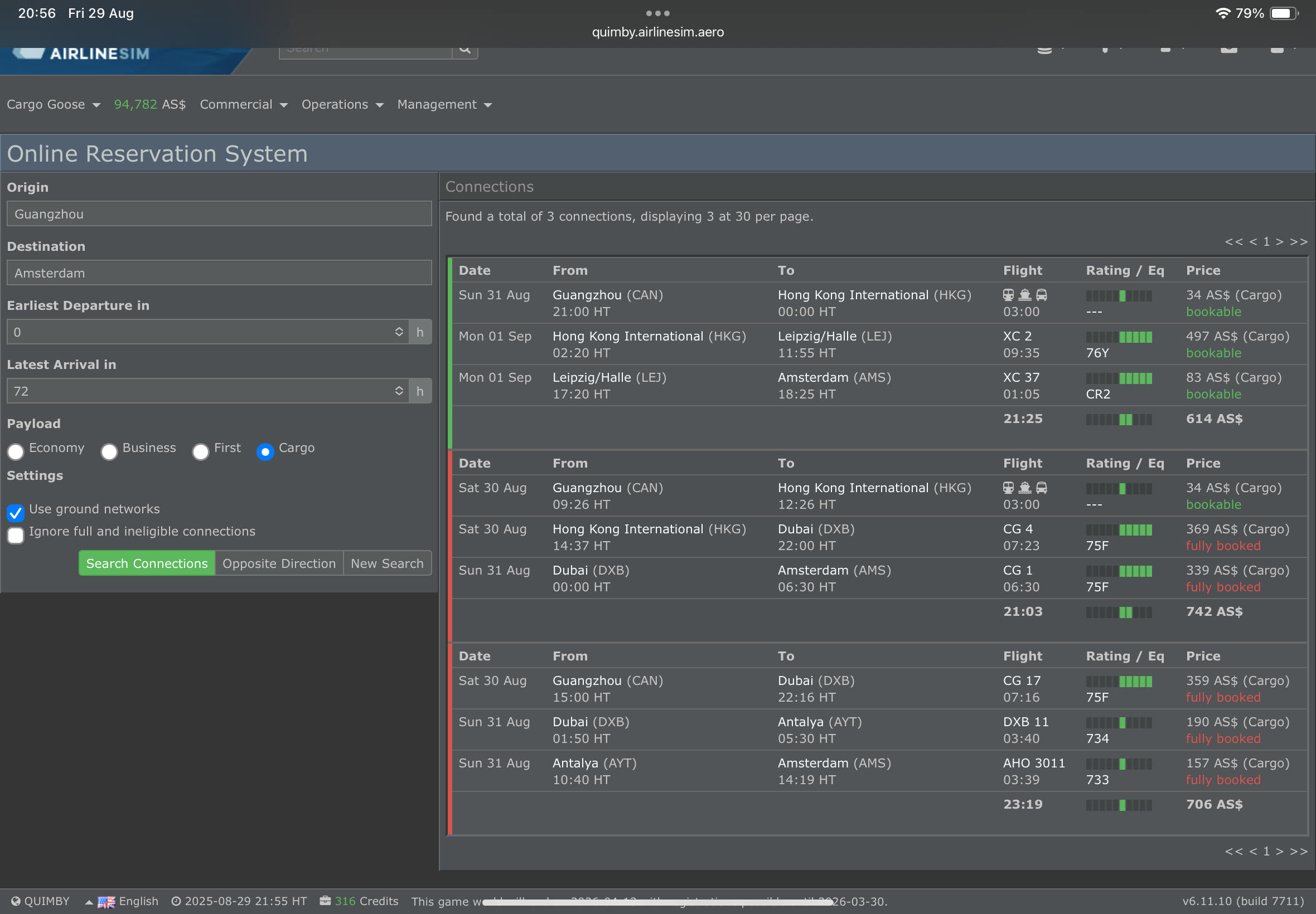 hello, I have another cargo related question. Game world Quimby, hub in DXB. All my flights arrive in DXB before 22:30 and leave after 00:00, so any can transfer to any. One day is east-west and the next day west-east.