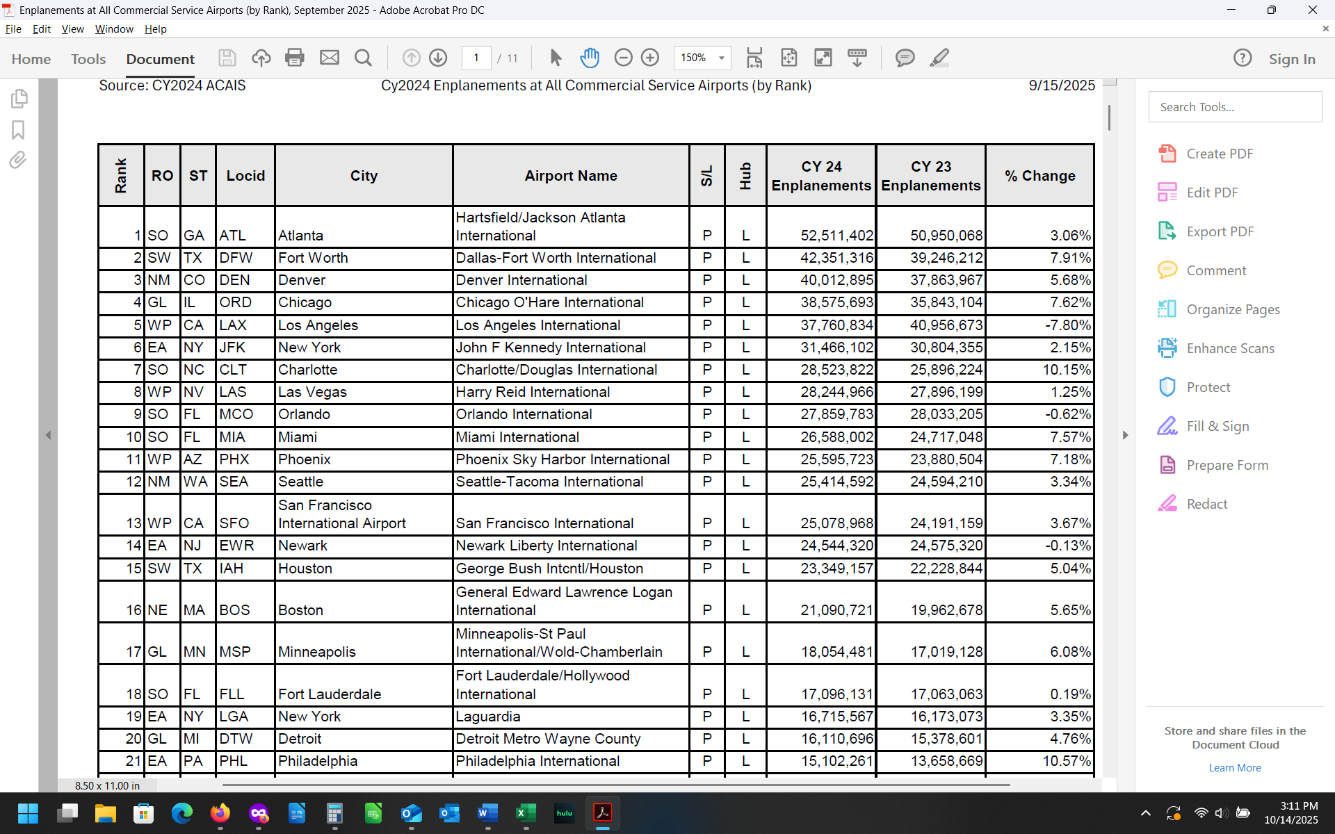I have extracted a piece of the chart from the 15 September 2025 United States Federal Aviation Administration report on passenger enplanements enlarged to show only the first 21 largest United States Airports by enplanements.