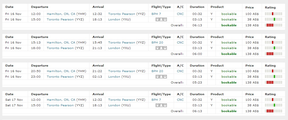 In your example there is a flight departing at 12.00 from Hamilton and arriving at 12.32 to Toronto. Then there is a connection (either by train, or ferry or bus) leaving Totonto at 15.00 and arriving to London at 18.13.